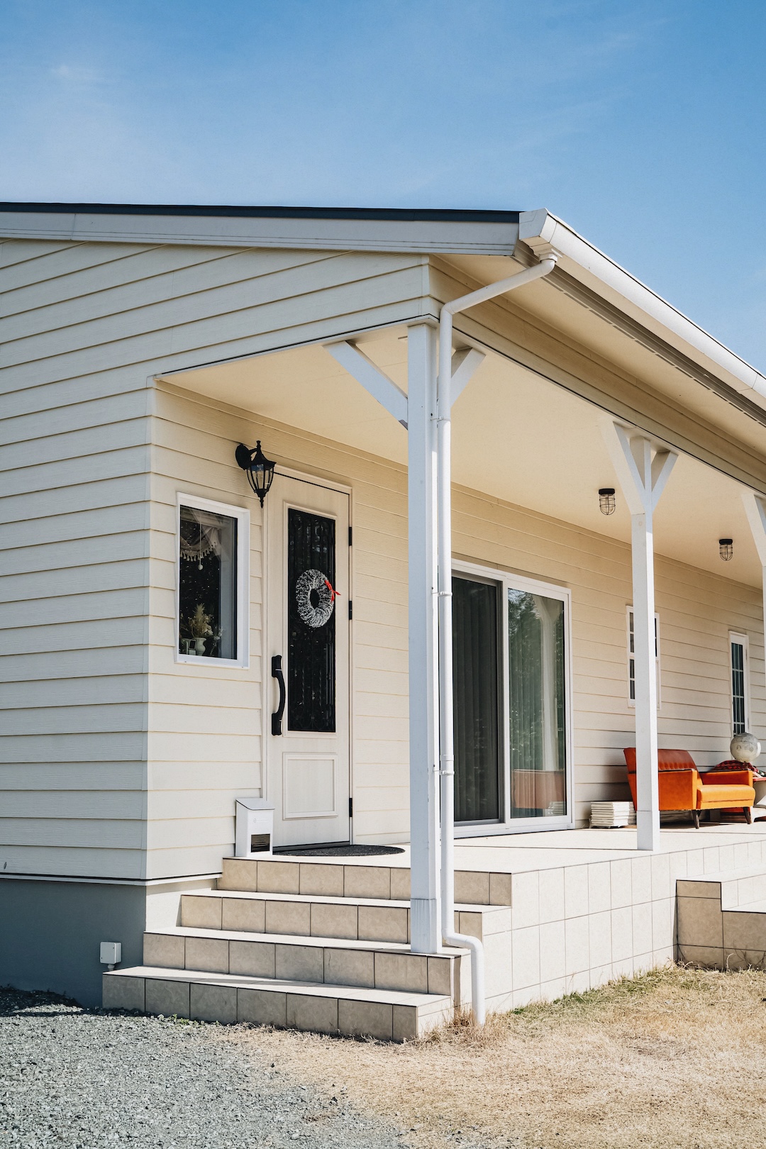 こちらのSさま邸は、南向きの玄関ポーチに深めの軒を取り入れました。