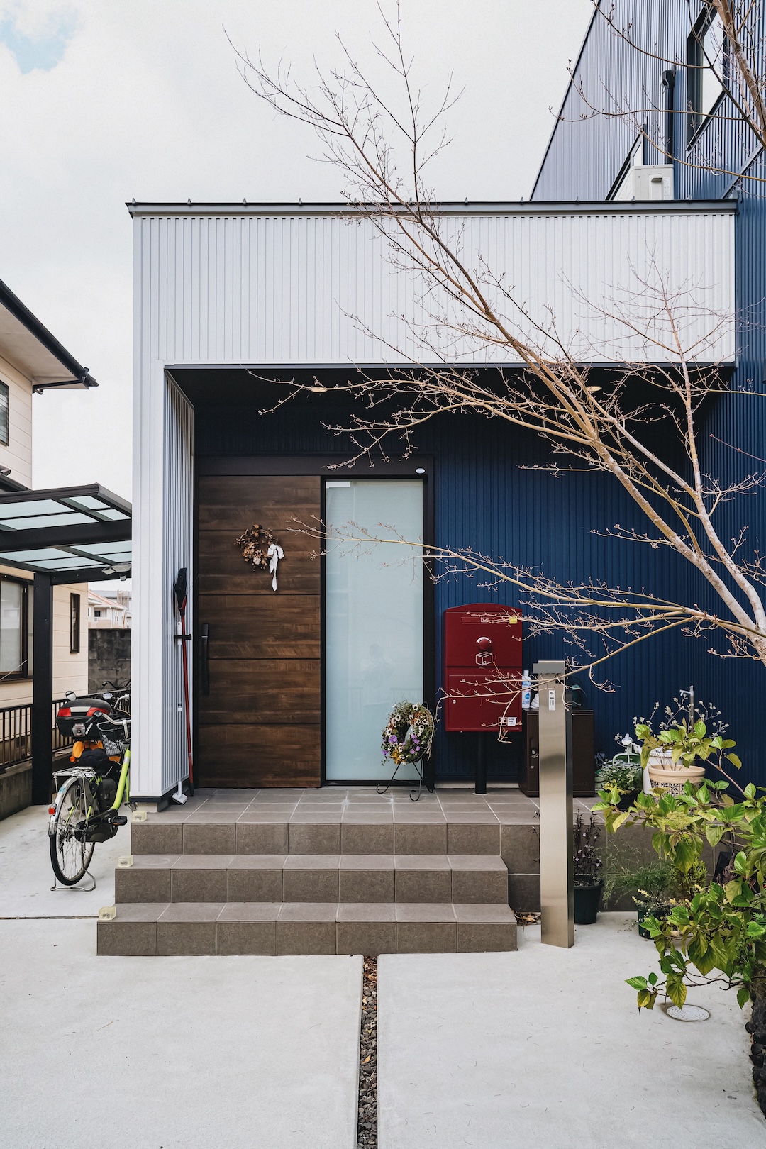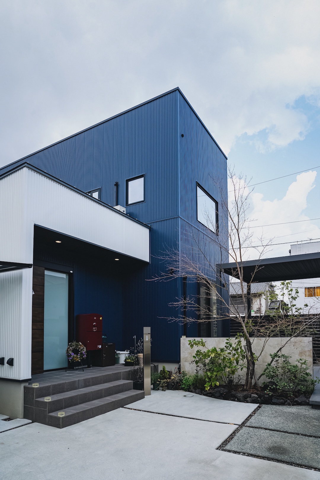 外観は、ネイビーとホワイトのガルバリウムでスタイリッシュに。