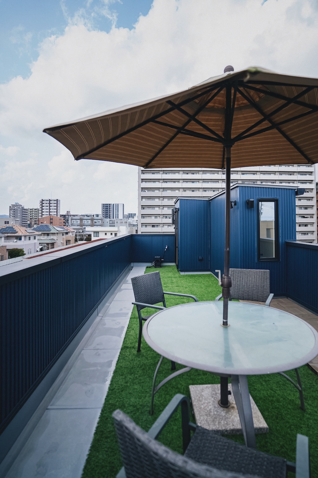 屋上には人工芝を敷き、気持ちのいい空間に仕上げました。ここで夜景を眺めながら、お酒を楽しんだり♪地上の庭よりも人目を気にせずのんびりと過ごせるのが、屋上庭園の良いところです。