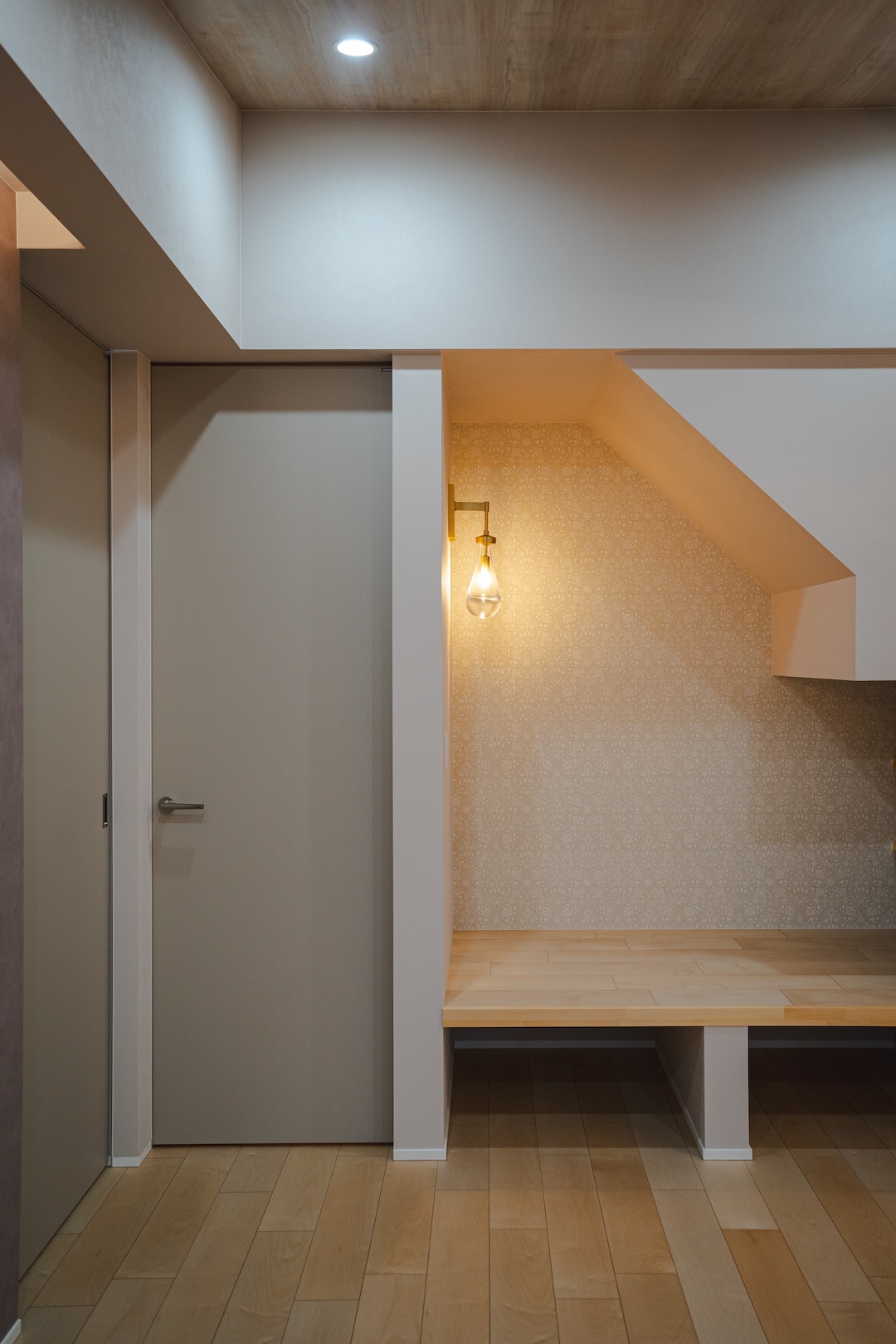 こちらはお子さんの遊び場や本置き場として使うためにお造りしたので、照明をつけて壁紙も可愛らしい柄をチョイスしています。