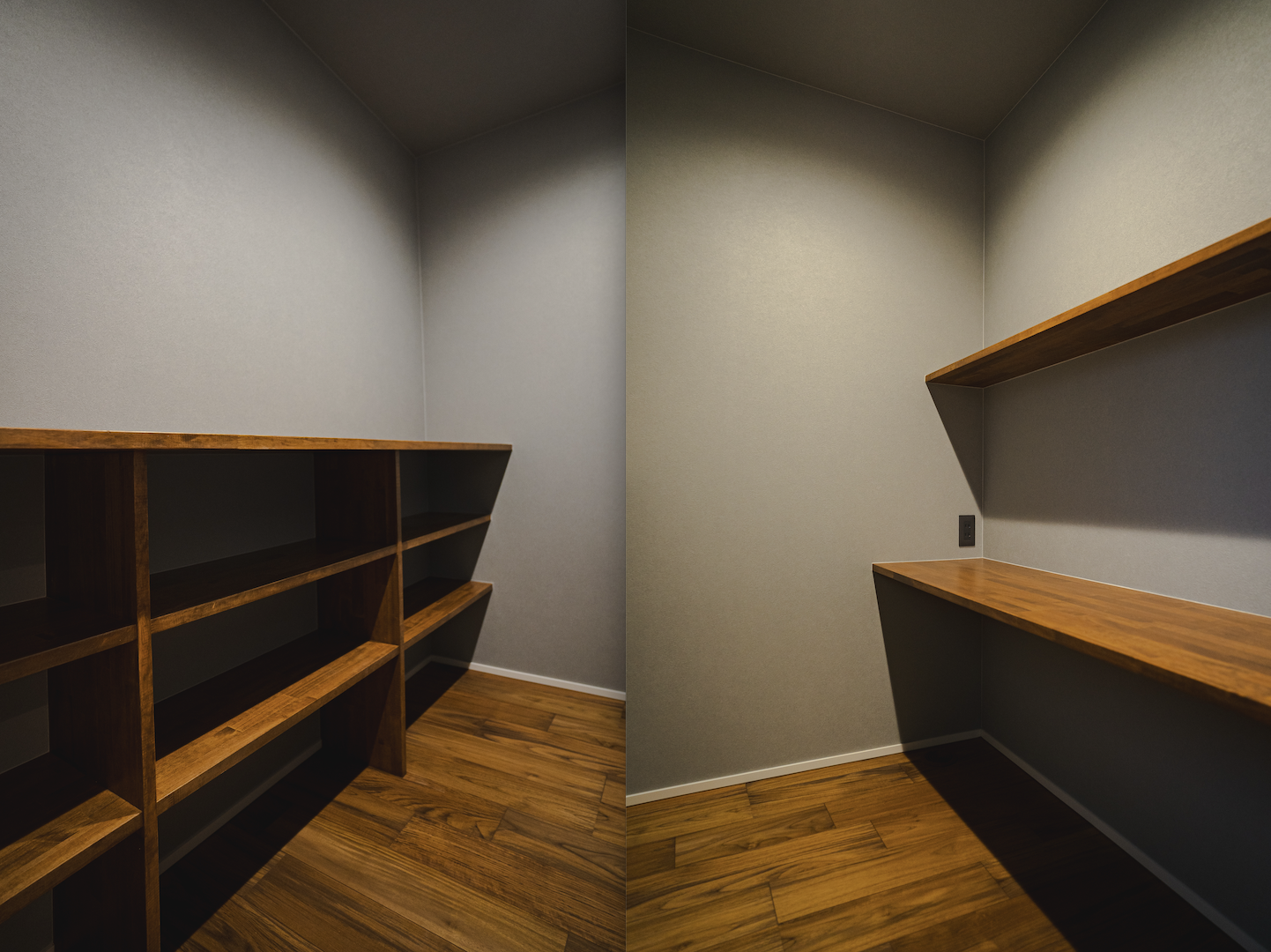 奥さま専用の書斎は、グレーと深い色合いの木目でシックに。